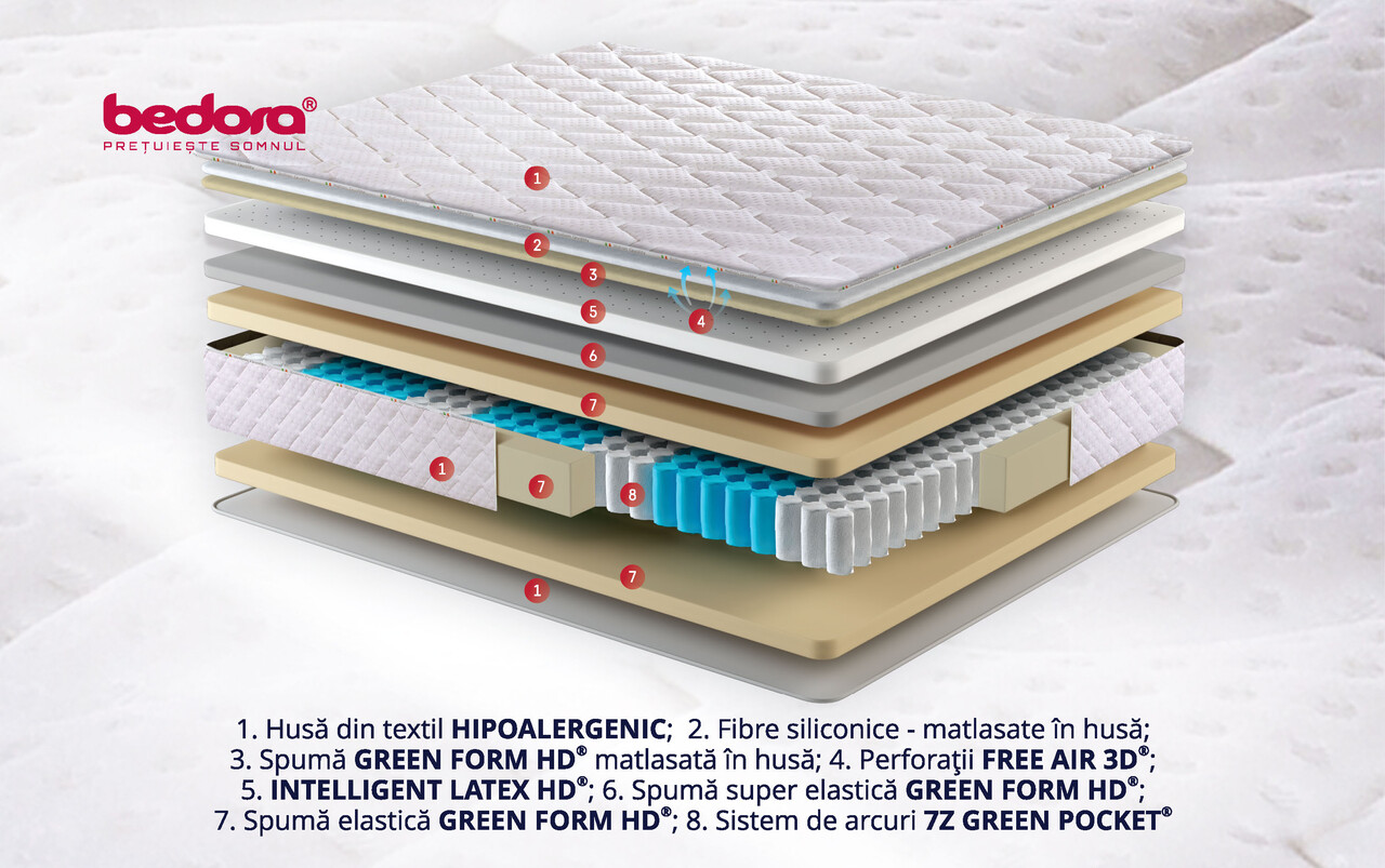 Salteaua Elite Pocket Latex, realizata din materiale de calitate superioara, combina in mod ideal tehnologia arcurilor impachetate individual 7Z Green Pocket®, spuma elastica Green Form HD® si spuma Intelligent Latex HD® pentru un confort ortopedic si anatomic excelent.