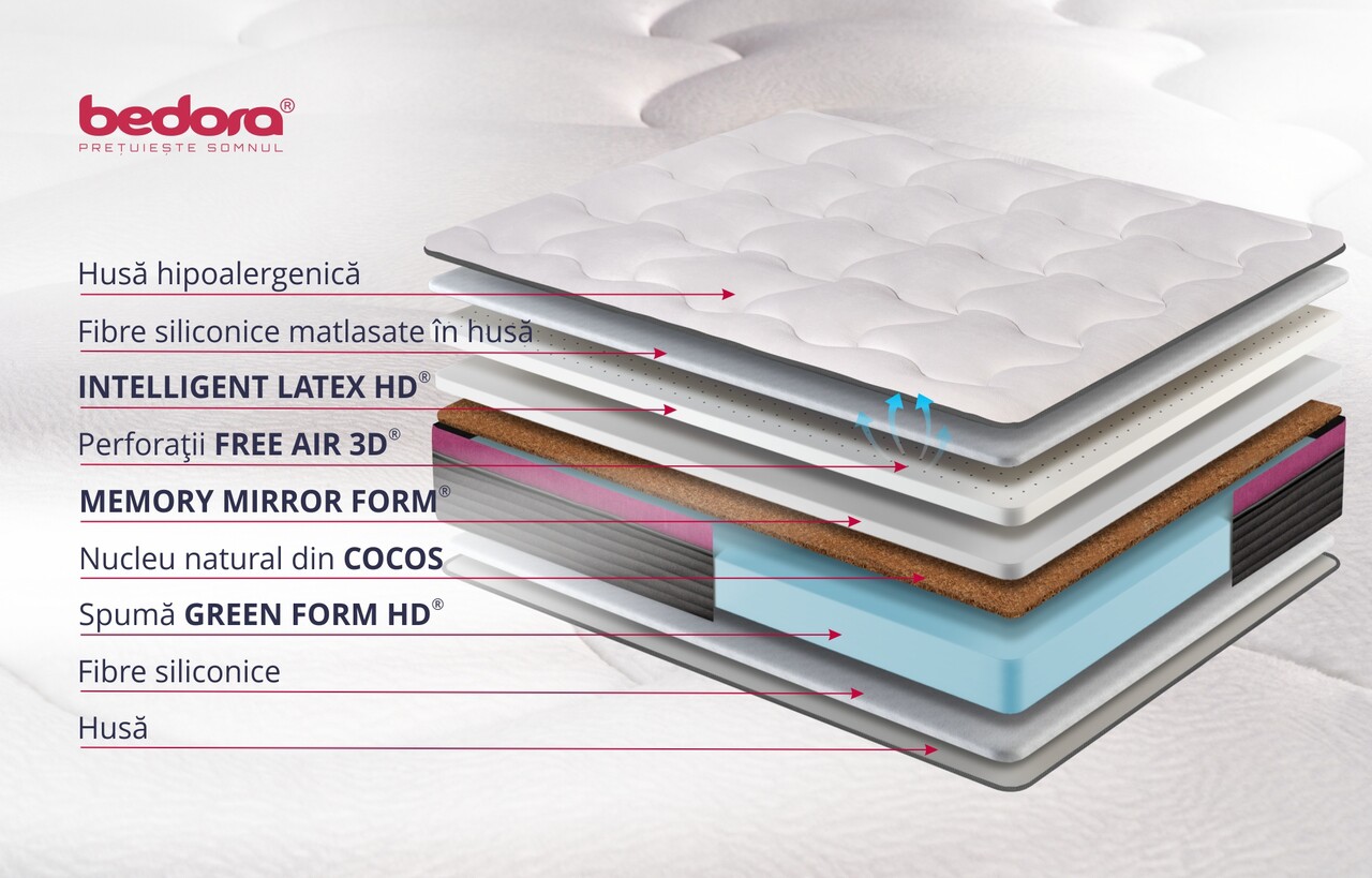 Stratul generos de 3 cm de spuma Memory Mirror Form® 7 Zone de Confort reactioneaza la caldura corpului si se muleaza pe acesta eliminand punctele de presiune pentru a relaxa muschii si a asigura o circulatie a sangelui corespunzatoare, in timp ce stratul de 3 cm Intelligent Latex HD®, prin flexibilitatea si elasticitatea lui, permite o mai buna sustinere a corpului, oferind un confort deosebit in timpul somnului.